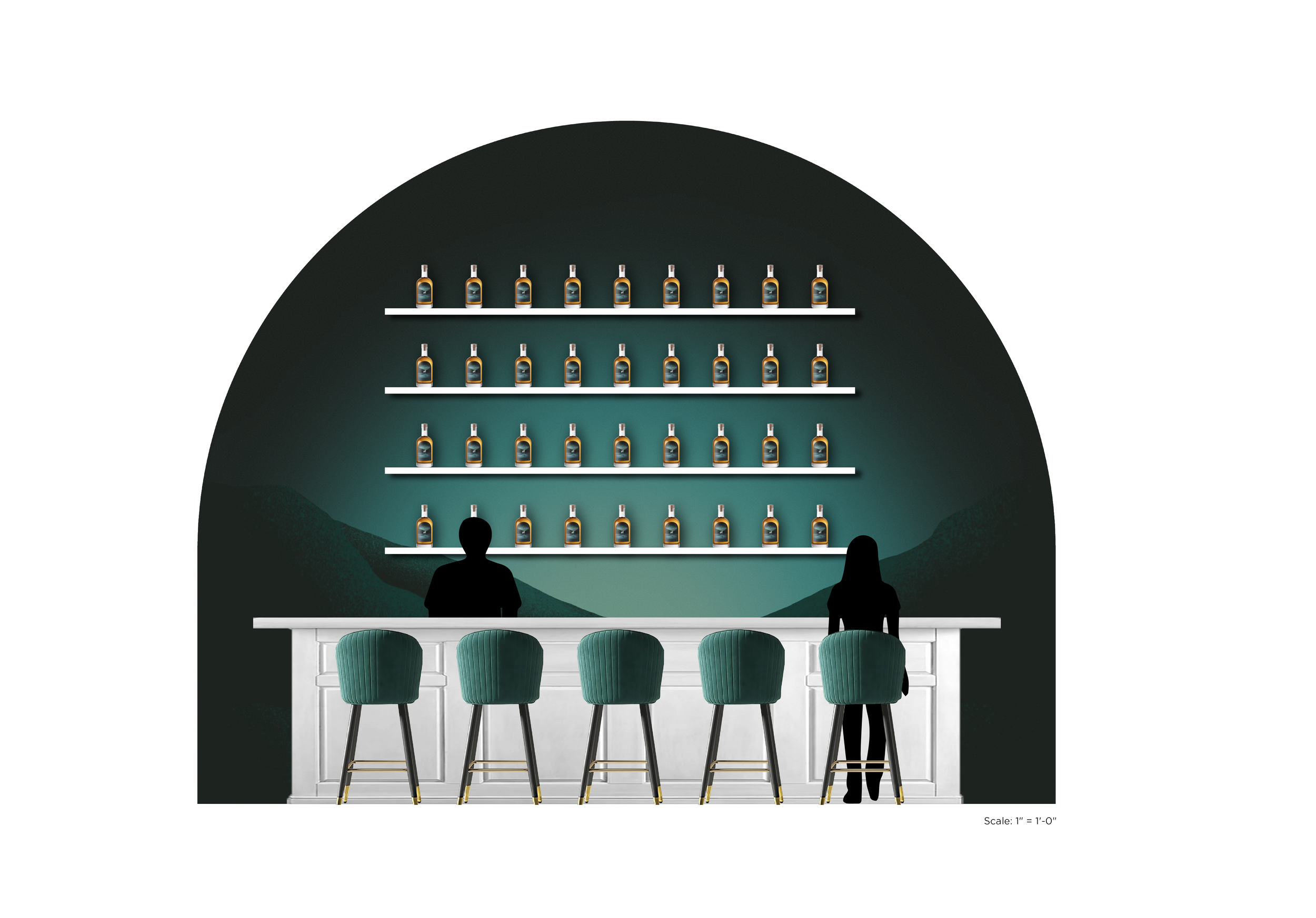 To the right are concept mockups for a pop-up experience to introduce the new White Horse Whiskey. The exterior is meant to emulate a traditional pub feel but with modern elements. The main features of the pub would be the bar, featuring drinks made with White Horse Blended Scotch Whiskey, and the “Instagram Wall.” The Instagram wall will feature the new label illustration and a life size horse sculpture, also from the label, with a neon/LED White Horse sign.